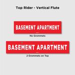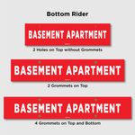 Let the word out about your new listing placing eye-grabbing BASEMENT APARTMENT Riders on your primary for sale sign. The product is made with durable, weatherproof Coroplast 10mm. Various sizes, grommet options and riding styles are available