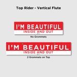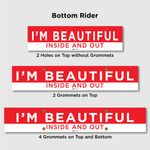 Entice pedestrians and drives to take a look inside using I'M BEAUTIFUL INSIDE AND OUT Riders. The product is made with durable, weatherproof Coroplast 10mm. Various sizes, grommet options and riding styles are available