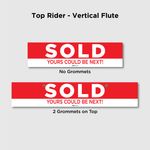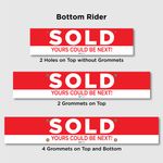 The Red and white SOLD YOURS COULD BE NEXT Riders are perfect attention grabbers, silently telling local home hunters there is something “there” they shouldn’t miss! The product is made with durable, weatherproof Coroplast 10mm. Various sizes, grommet options and riding styles are available